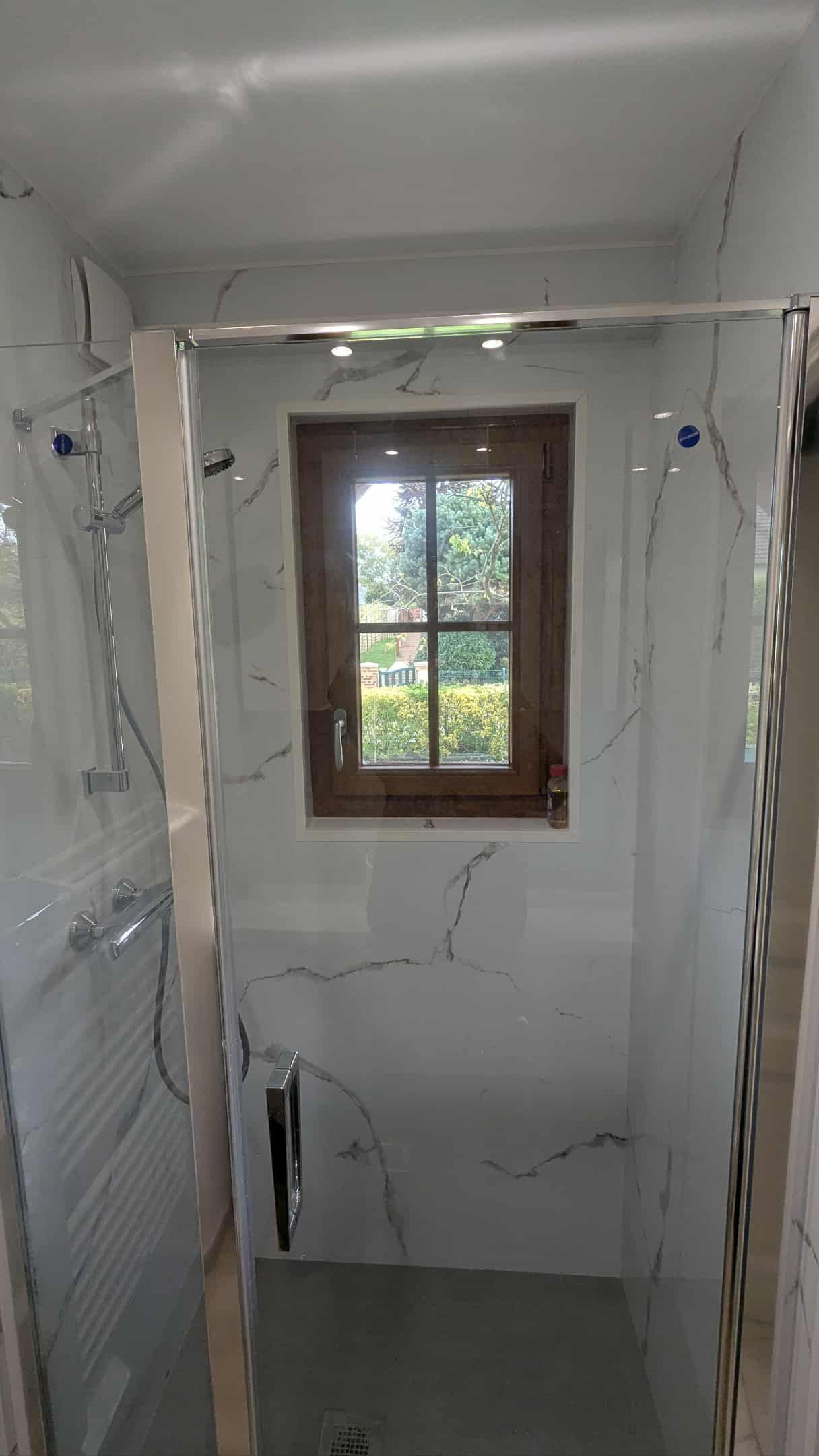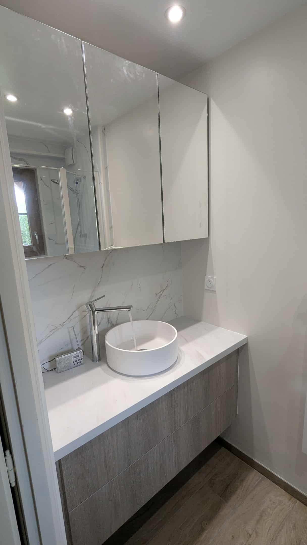 Dans le cadre de cette rénovation de salle de bains à Saint-Romain-De-Colbosc, nous avons détruit tout l'ancienne salle de bains avant de mettre un nouveau meuble, une nouvelle vasque, ainsi qu'une cabine de douche en prenant soin de faire attention à la fenêtre sur le bord de cette dernière.